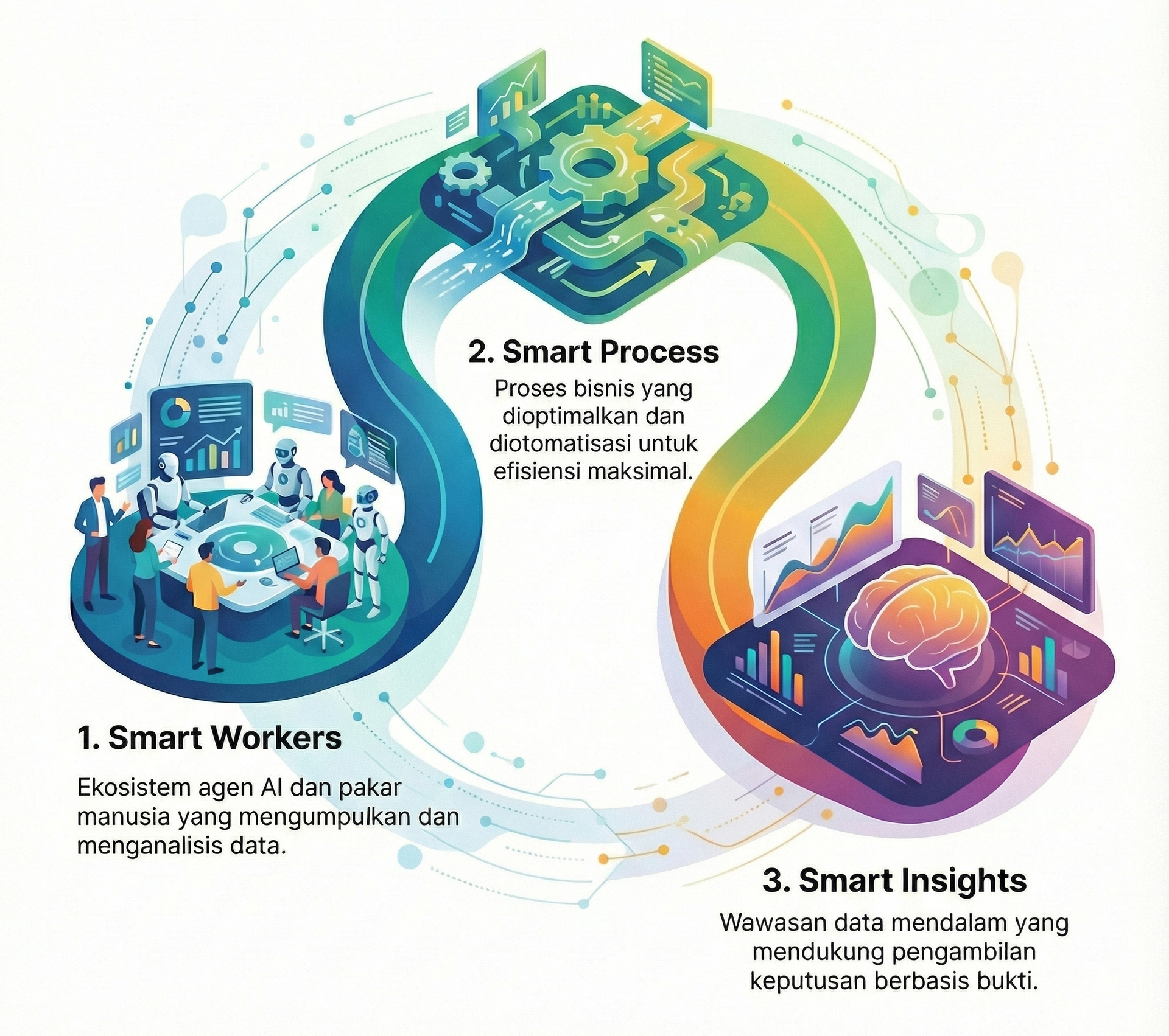 - Smart Workers: Ekosistem agen cerdas—kombinasi AI otonom dan pakar manusia—yang bekerja dalam peran spesifik untuk menggerakkan proyek. Mereka tidak hanya menjalankan tugas, tapi juga berinisiatif, berkolaborasi, dan beradaptasi guna memastikan data dikumpulkan, diproses, dan dianalisis secara efisien serta relevan dengan tujuan bisnis.